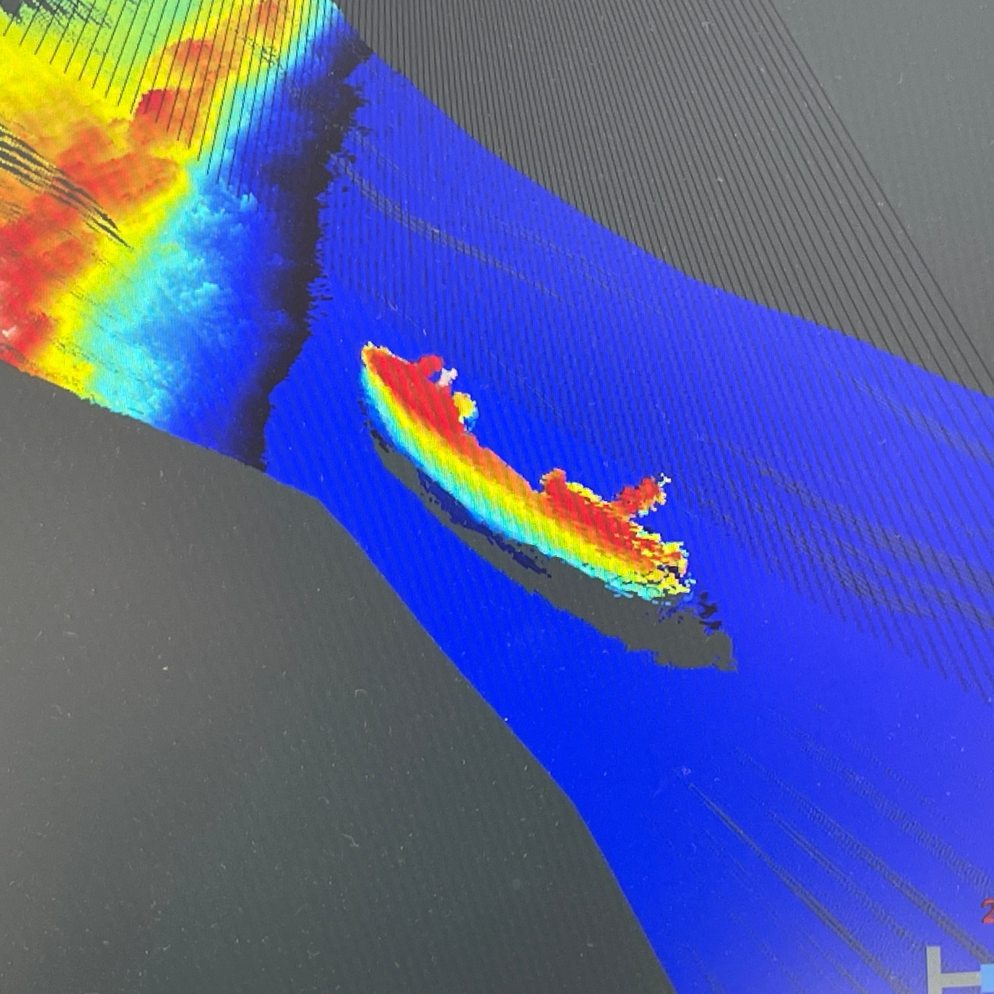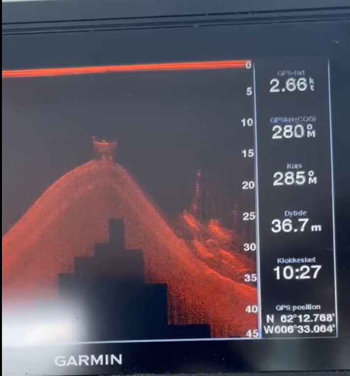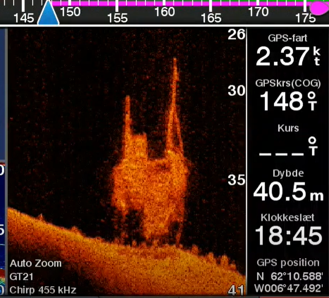 Vilhelm Hansen (2024) tók sonar mynd ið vísti at Helena liggur frá 25 m til 36 m dýpi.