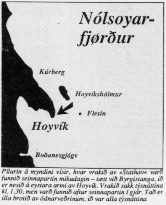 Staðfesting Skipið bleiv vrak stutt aftaná at hava veri í Hvalba. Stórur partur av manningini rýmd til Vestamanna, so eg giti skipi er vorið vrak nær Streymoy ella Eystoroy.